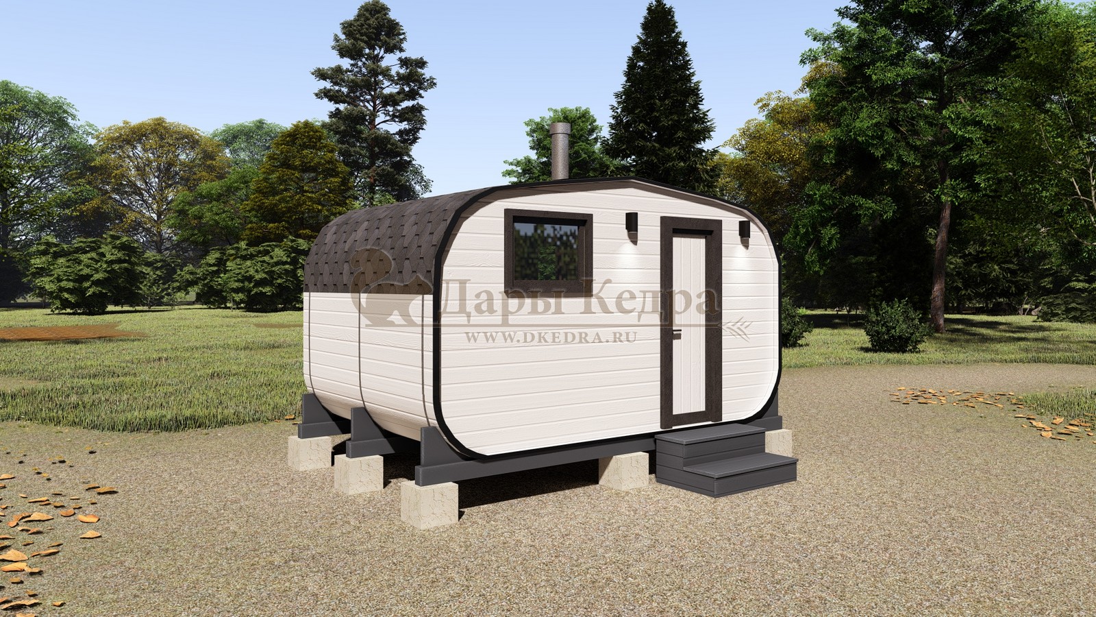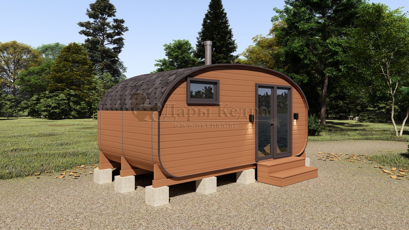 Баня-бочка буханка из кедра 3 метра Это более просторная модель за счет увеличенной высоты потолков и ровного пола. В такой модели раздевалка совмещена с моечной. Тут установлен душевой поддон, вешалка, полочка и лавочка из кедра. В парильном отделении по обе стороны расположены двухуровневые открытые полки, печь находится между ними у дальней стены. Время растопки такой бани не превышает 30 минут. По вашему желанию баню-бочку можно укомплектовать козырьком, верандой и печью с внешней загрузкой, благодаря которой весь мусор во время топки остается на улице. Баня-бочка буханка не требует полноценный фундамент, поэтому при необходимости ее можно перенести в другое место. Обращаем Ваше внимание, что в стандартную комплектацию бани входят полки открытого типа в парной с обеих сторон. Дополнительно можно заказать полок закрытого типа или лавку! Кедр обладает ароматическими свойствами. Он не деформируется и влагоустойчив, при правильном уходе за деревом на нем не развиваются грибки и плесень.